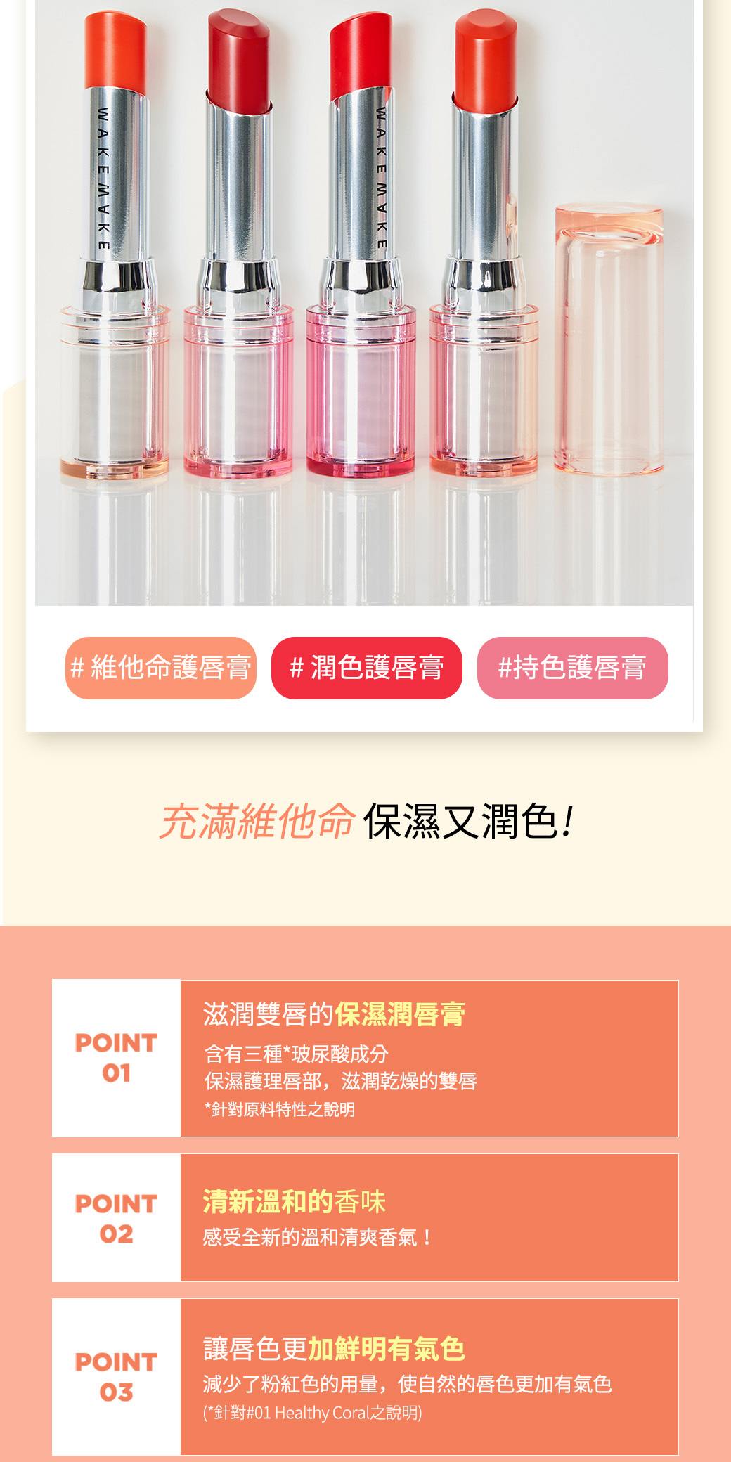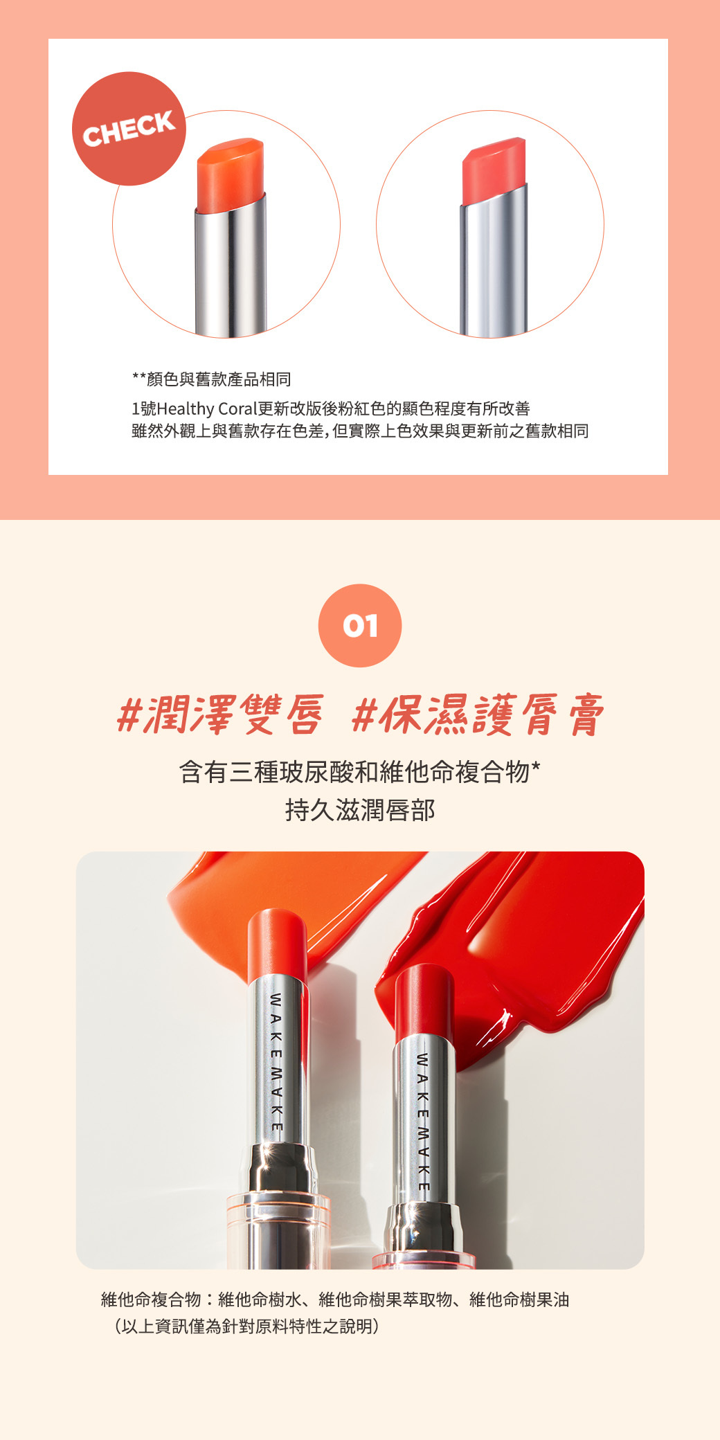 ✨含有三種玻尿酸和維他命成分,持久滋潤唇部。